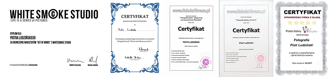 Z pewnością mówię, że “Wasze wspomnienia są w dobrych rękach” o czym świadczą certyfikaty, które uzyskałem podczas rozmaitych szkoleń. Dodatkowo zostałem doceniony przez międzynarodowe, stowarzyszenia WPEawards czy MyWed zostając ich stałym członkiem,